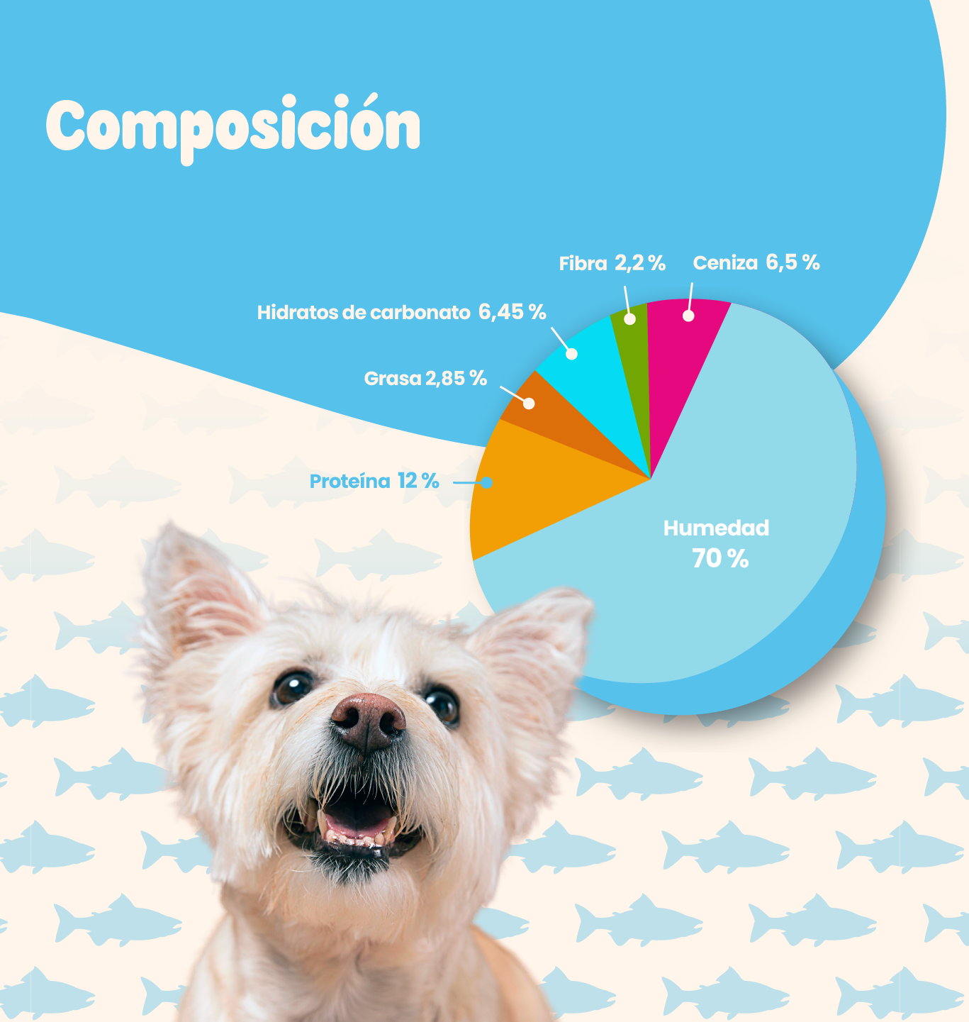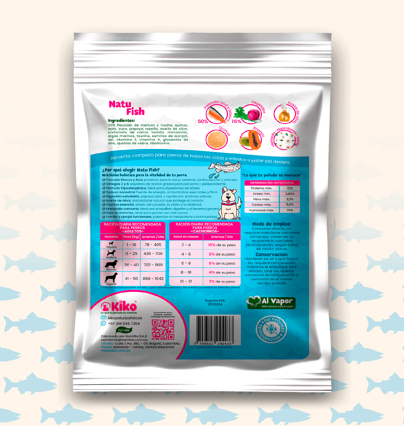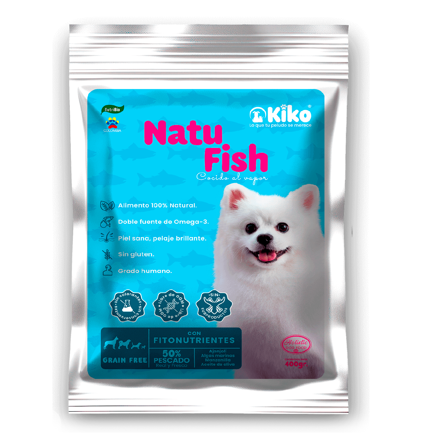 Natu Fish es un alimento húmedo natural para perros, completo y balanceado para todas las razas y edades, elaborado con merluza y trucha grado humano, cocidas al vapor en sus propios jugos para conservar nutrientes esenciales, sabor natural y máxima seguridad alimentaria.
