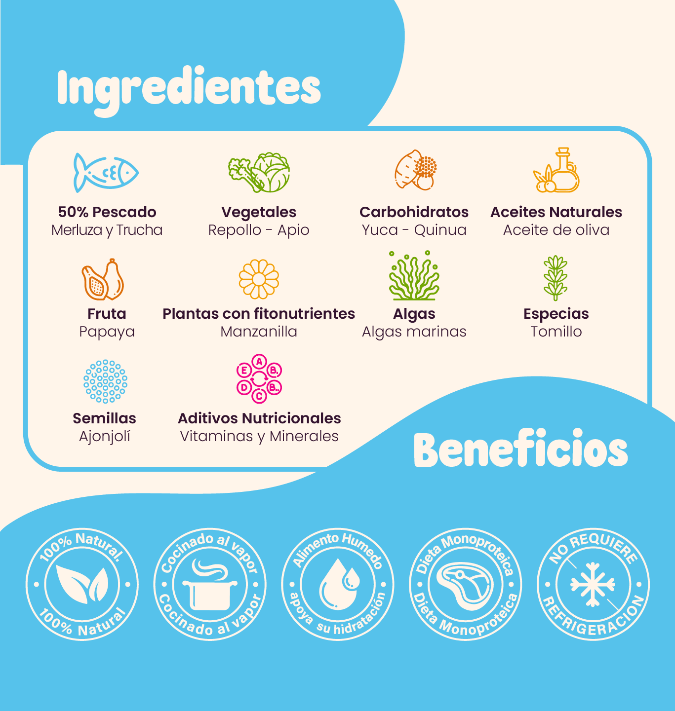 Merluza y trucha (50%), repollo, apio, yuca, quinua, papaya, aceite de oliva, ajonjolí, algas marinas, manzanilla, tomillo, vitaminas y minerales.