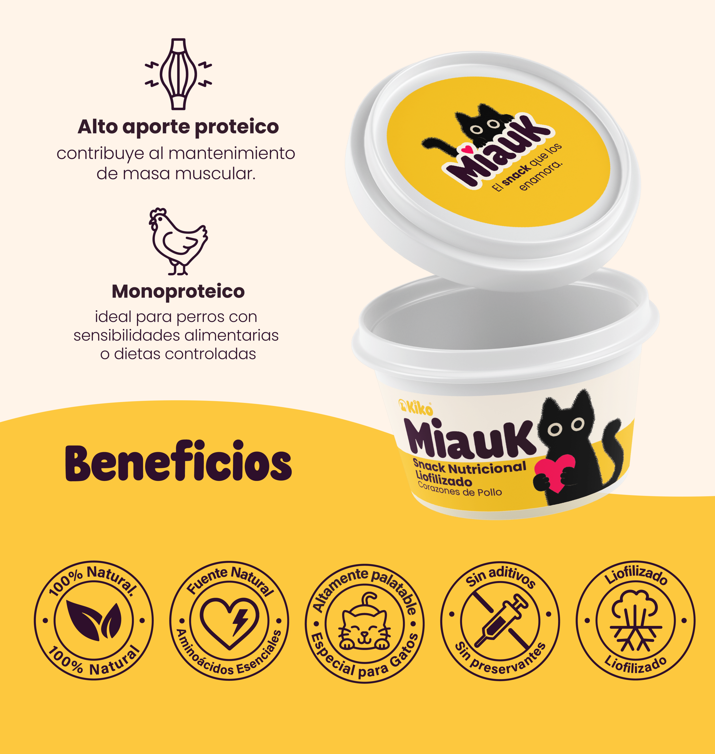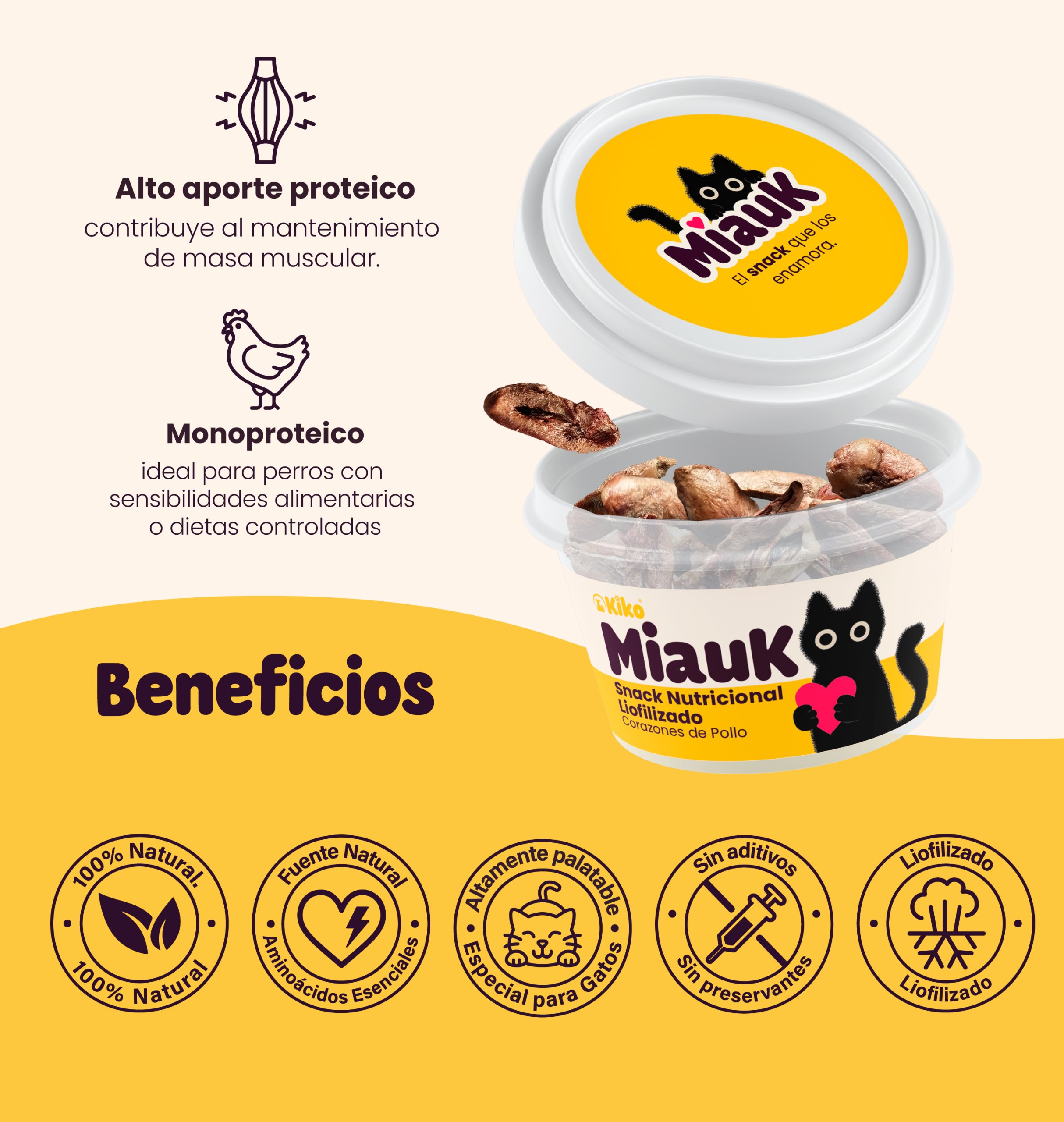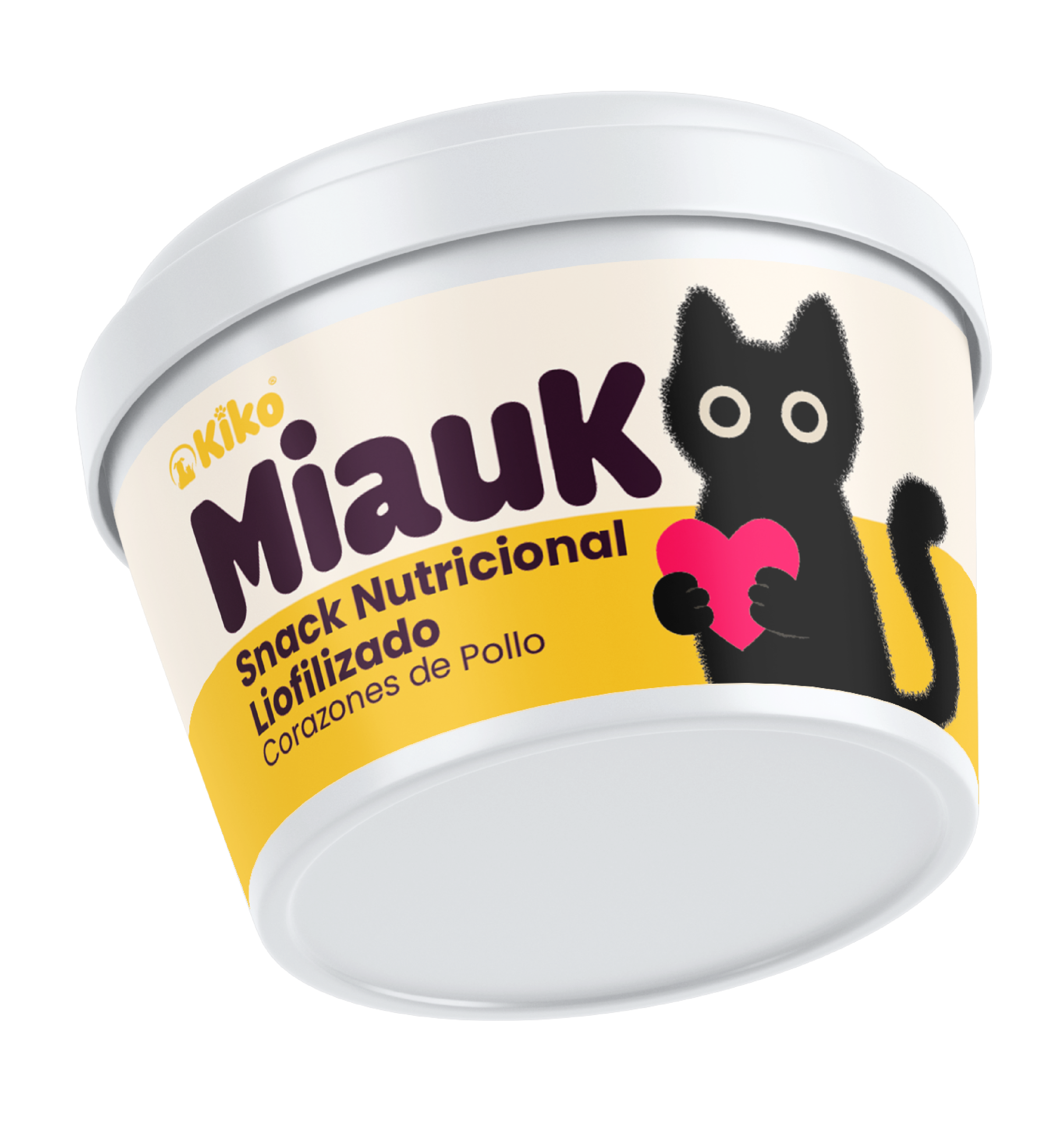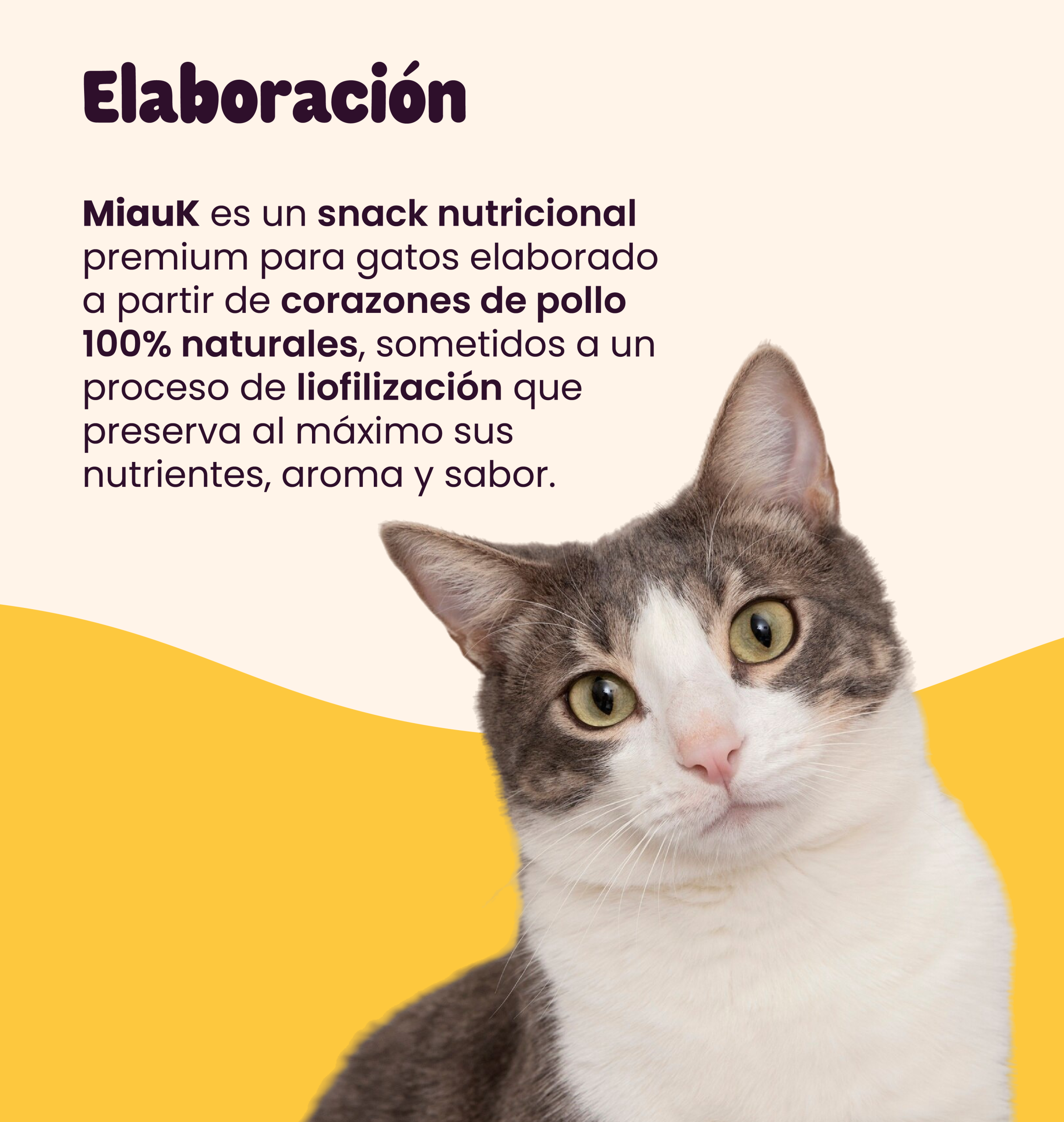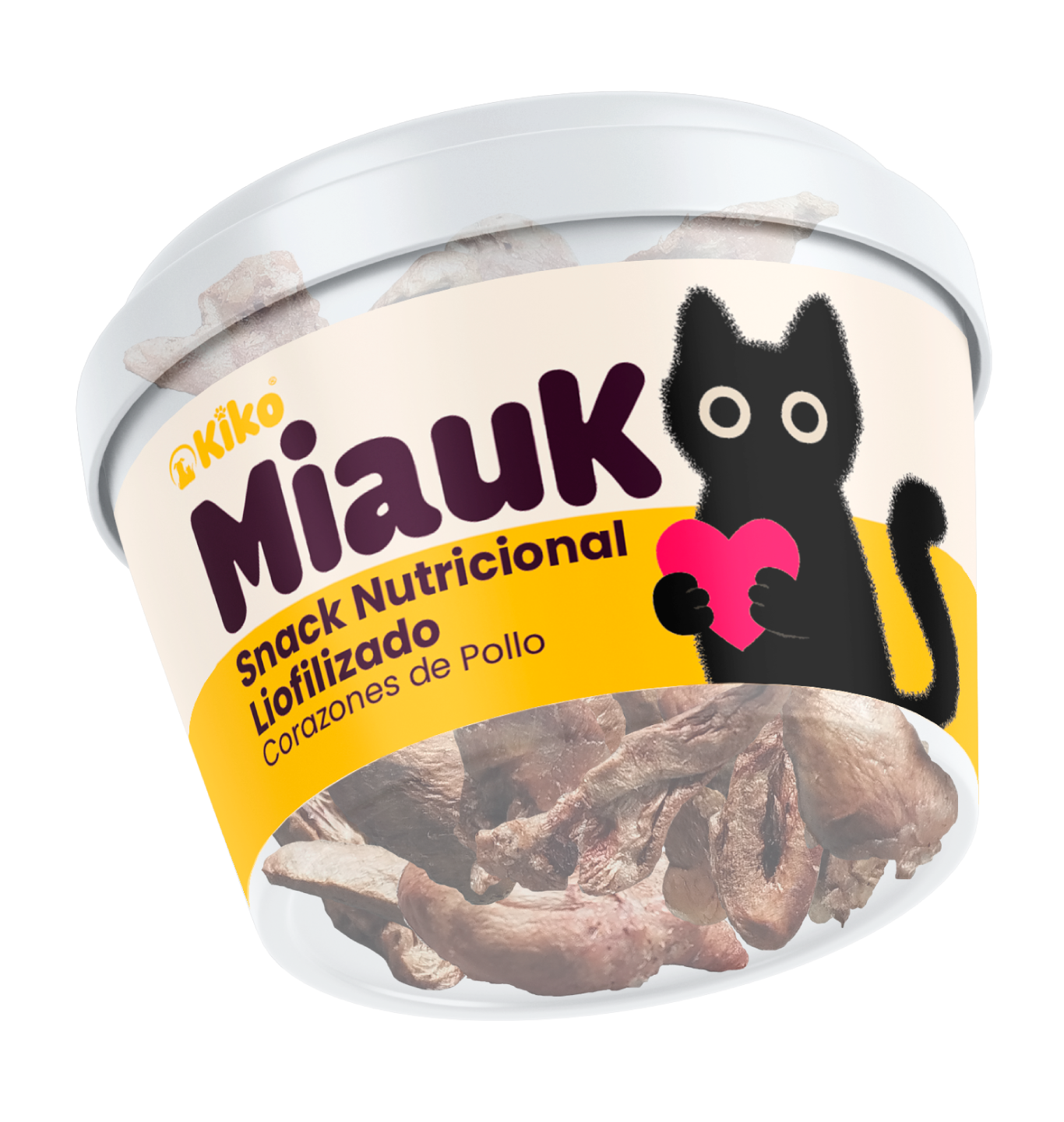 MiauK® es un snack nutricional premium para gatos elaborado con corazones de pollo 100% naturales, sometidos a un proceso de liofilización en frío que conserva sus nutrientes, aroma y sabor sin necesidad de conservantes.